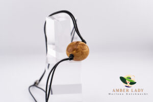 The amber is strung on a black jewelry cord, which beautifully contrasts with the warm tones of the stone, highlighting its natural color and form. The jewelry cord is durable, lightweight, and comfortable, making the necklace suitable for everyday wear or special occasions. Its minimalist design allows the amber to shine as the focal point while giving the piece a contemporary and elegant look.