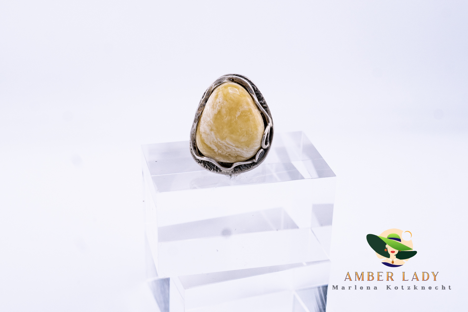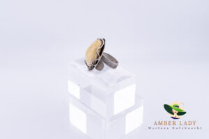 This unique ring features a milky-cream Baltic amber stone, combining the natural beauty of the gemstone with masterful craftsmanship. The large, one-of-a-kind amber centerpiece exudes elegance and subtle charm, making each ring a truly distinctive piece. Every stone is unique, ensuring that no two rings are exactly alike.