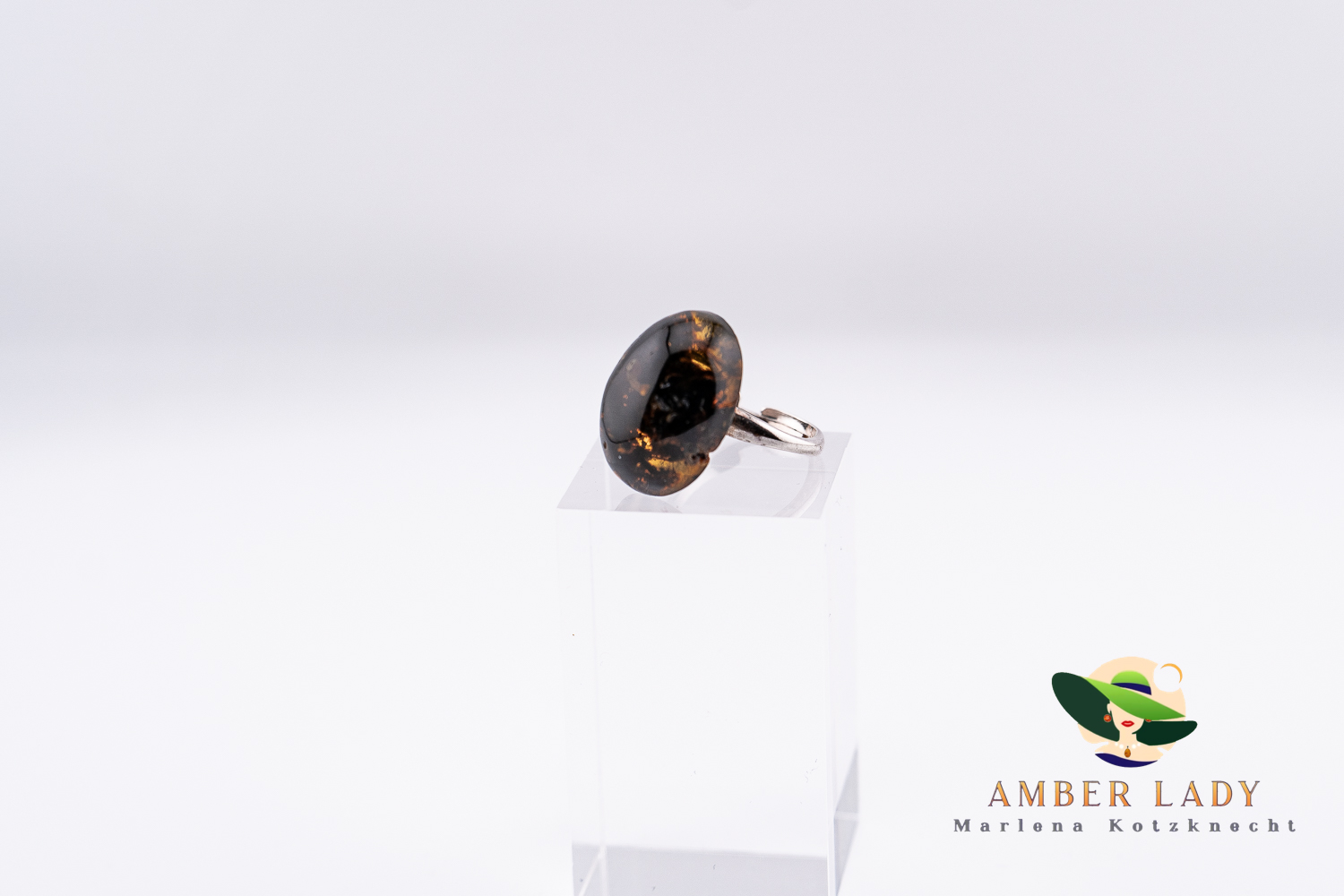 For centuries, Baltic amber has been admired not only for its beauty but also for its symbolic meanings. It is believed to carry positive energy, harmony, and strength, making it a gemstone full of charm and history. The combination of dark cognac tones with a natural plant inclusion makes this ring stand out as a unique accessory, perfect for women who value originality and the natural character of handcrafted jewelry.