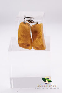 The amber captivates not only with its color but also with its natural amber bark, giving the earrings a distinctive, rustic appeal. Each amber slice is unique, making the jewelry truly one-of-a-kind. The delicate, dangling design adds a sense of lightness, allowing the earrings to hang gracefully near the face.