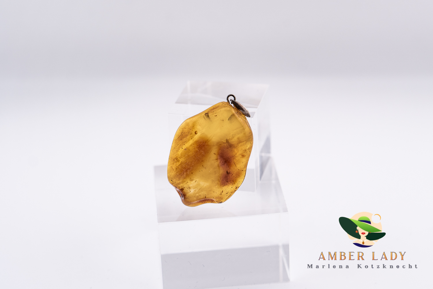 The pendant measures 5 cm in total length and 3 cm in width, making it noticeable and elegant while remaining lightweight and comfortable to wear. The amber is finished with a sterling silver 925 connector, which emphasizes the stone’s natural beauty and adds a classic touch. Sterling silver 925 ensures durability and long-lasting wear, allowing the pendant to be worn daily or for special occasions.